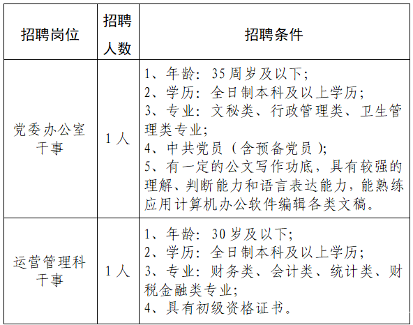 根据医院业务发展需求,现党委办公室、运营管理科需招聘干事2名,具体招聘条件如下: