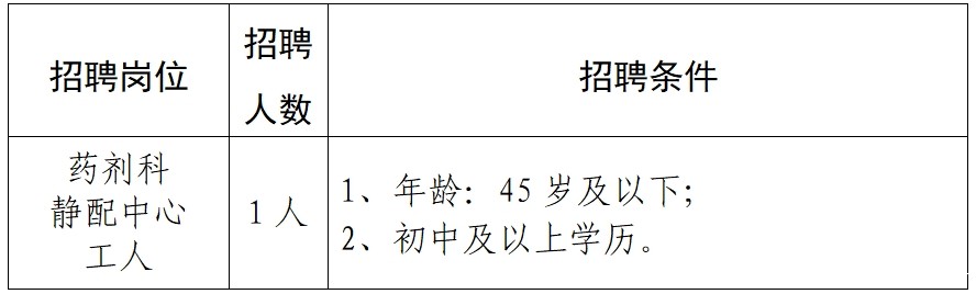 根据医院业务发展需求,我院药剂科静配中心需招聘劳务派遣工作人员1名,具体招聘条件如下: