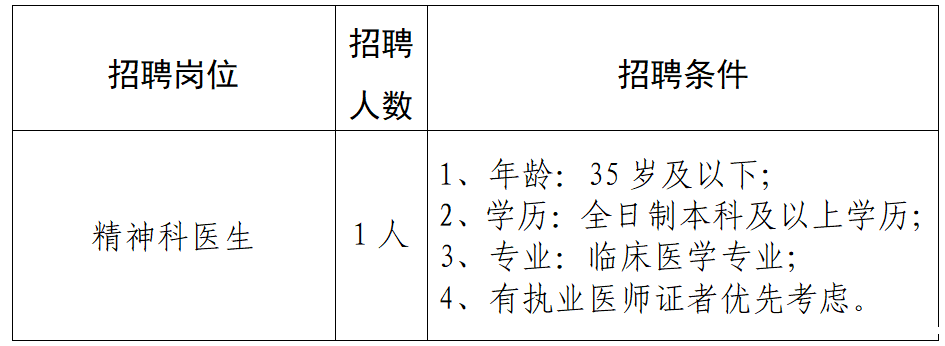 根据医院业务发展需求,现需招聘精神科医生1人,具体招聘条件如下: