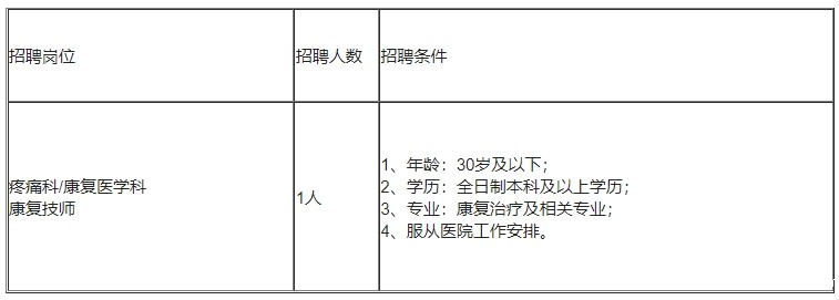 根据医院业务发展需求,现需招聘疼痛科/康复医学科康复技师1人,具体招聘条件如下: