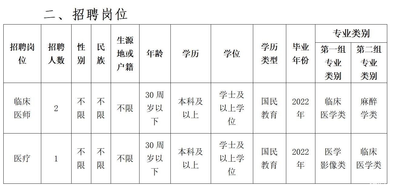 高等院校医学类本科及以上学历毕业后直接参加国家计划内住院医师规范化培训,2022年国家住院医师规范化培训合格且具有国家执业医师资格,参加医疗卫生行业招聘医学类岗位的,视为2022年度应届毕业生(资格复审时须提供成绩单、合格证明,否则取消聘用资格)。